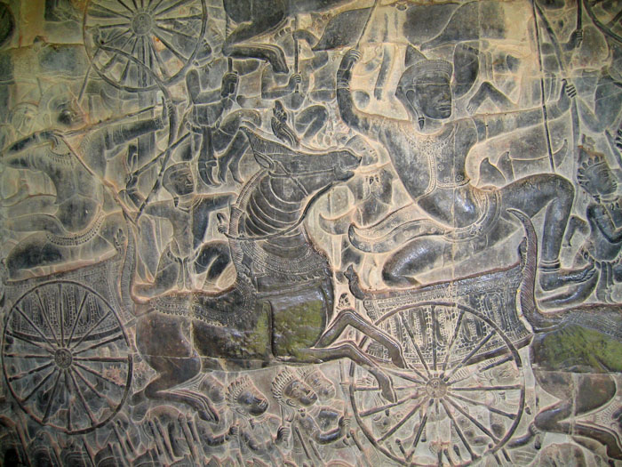 A scene from the panel “Battle of Kurukshetra”, part of the Hindu “Mahabharata” epic. This is a part of what would normally be the first panel viewed by a visitor, who would enter by the main West gate and circle the enclosure anti-clockwise in the Hindu tradition. Our guide took us clockwise from the East gate in an effort to avoid as many fellow tourists as possible.